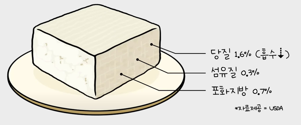 두부는 85% 정도가 수분이라서 배부르게 먹어봤자 거진 다 단백질이나 물 뿐이라는 거죠.