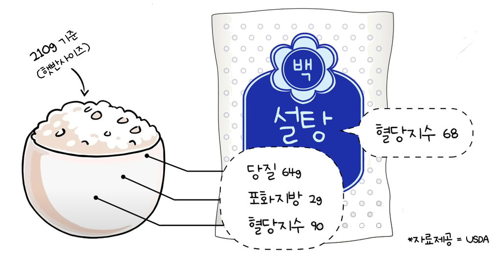 쌀밥 한 공기(햇반기준으로)가 당질 64g, 포화지방 2g 혈당 지수가 90인데,