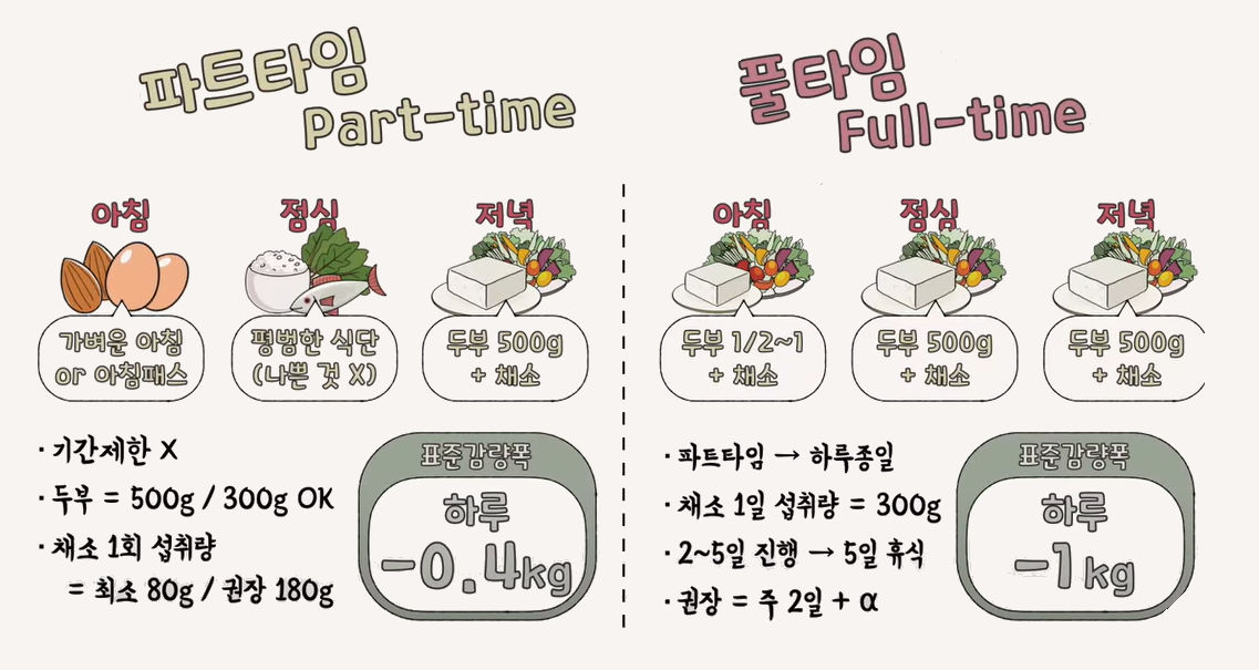 그래서 두부다이어트를 쉽고 안전하게 하려면은 풀타임 2일과 파트 타임 5일로 섞어서 한다거나