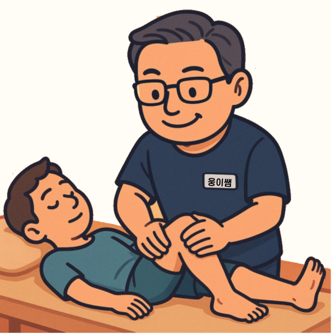 아래 그림은 친절하고 실력 있는 도수치료 전문가 웅이쌤이 환자에게 도수치료를 하고 있는 모습이에요. 이렇게 부드럽고 정확한 손길로 환자의 몸을 편안하게 만들어준답니다!